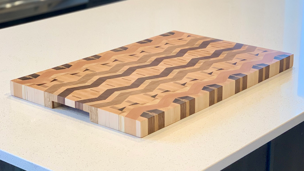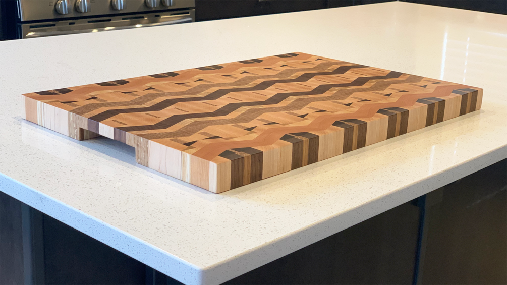 When you place an order, I’ll start working on your cutting board immediately. It will be very similar to the one in the pictures above, but not exactly the same. The dimensions will be the same, the selection of wood species will be the same, the handle styles will be the same, and the major pattern features will be the same. But there’s an element of randomness in the kaleidoscope design that makes each board unique. I will send you photos as your cutting board starts taking shape, and you’ll have the option to see another design if you don’t like the first one. If you’re still unsatisfied with these designs, you’ll get a full refund — no questions asked.