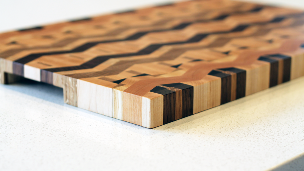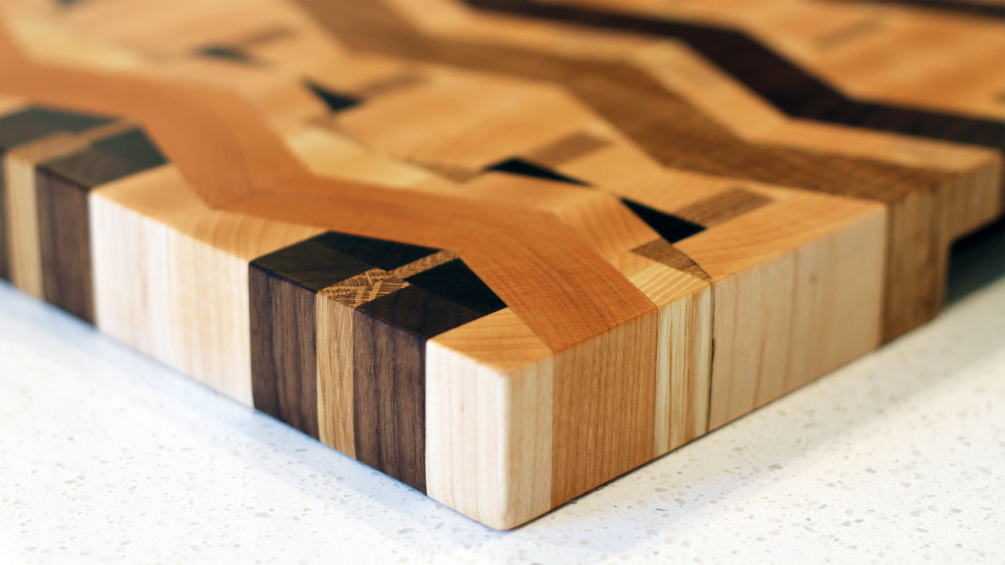 The Alaska is made from small pieces of hardwood cut at alternating 22.5° angles that are symmetrically arranged to create a mesmerizing kaleidoscope effect. Five wood species are used to make this pattern: walnut, cherry, maple, oak, and ash. The walnut creates the distinctive dark accents, while the maple and ash add a light tone to the overall board. The oak and cherry pieces add a striking contrast with their earthy colors.