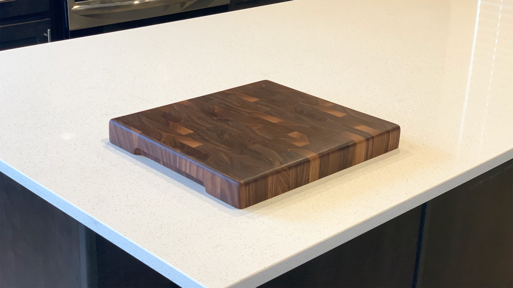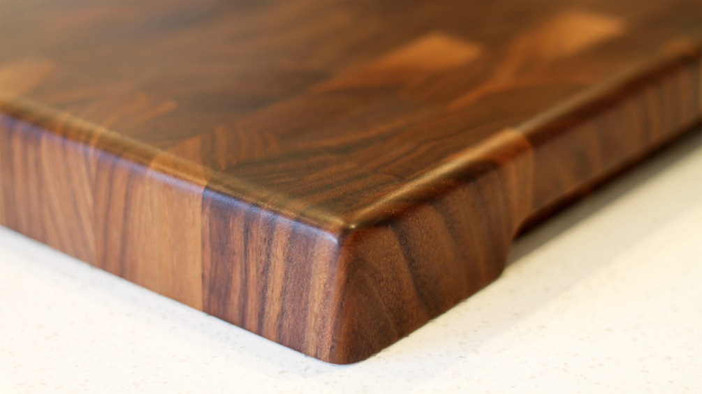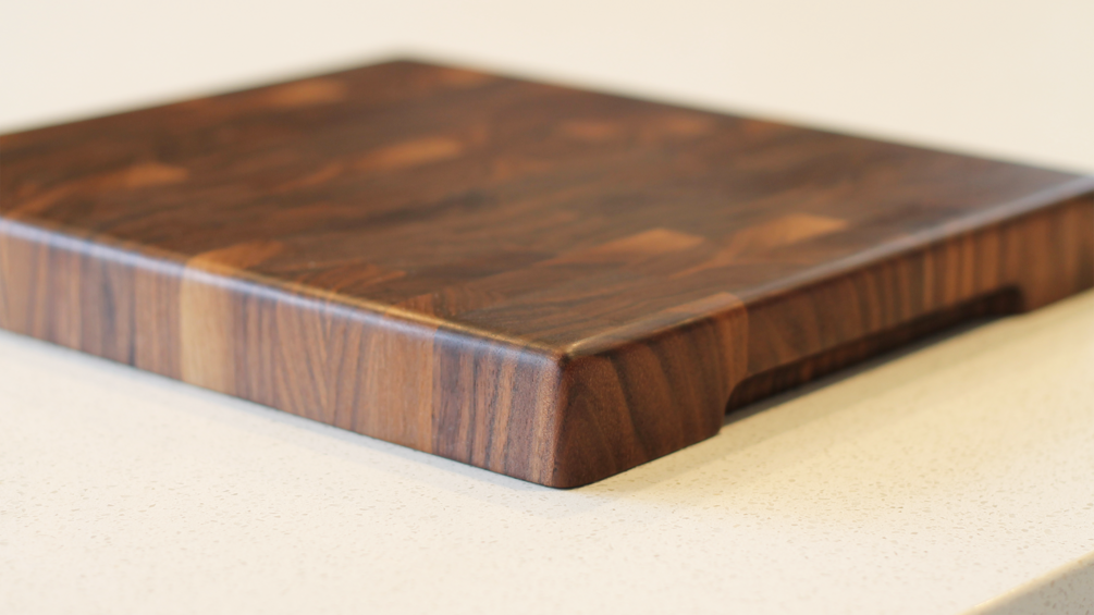 The Iowa is made from pieces of American black walnut rotated on their end grain and arranged in a brick-style pattern. The wood is selected from different trees of the same species so that the brick pattern looks completely random. A deep roundover on the top and side edges adds a soft touch to the design, and makes the board very pleasant to handle.