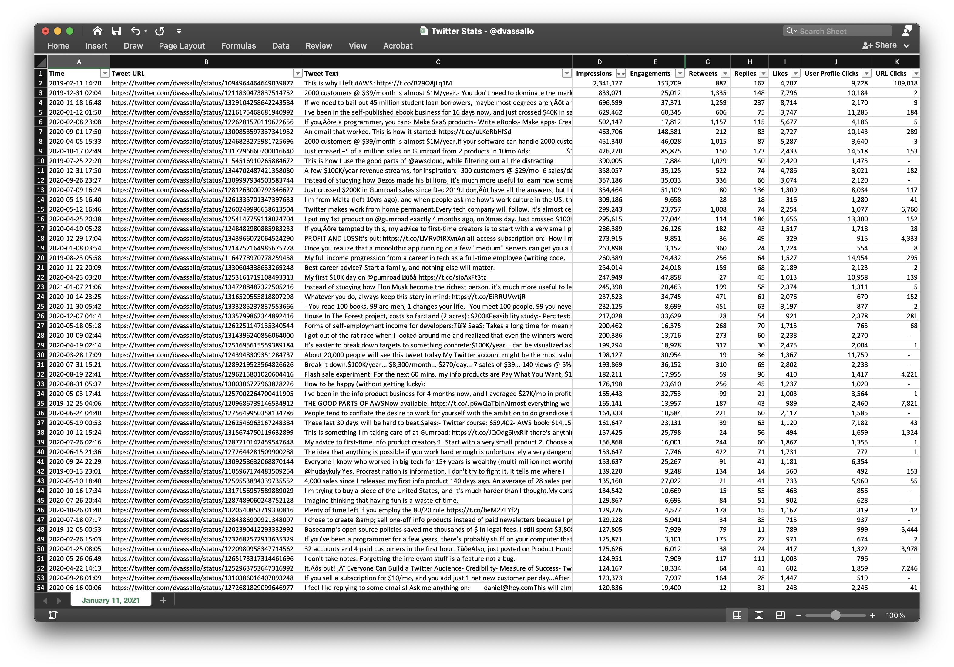 Explore the performance of every tweet by @dvassallo. Sort by impressions, likes, retweets, profile clicks, replies, or any other metric. See which tweets performed best, and what type of engagement they got.